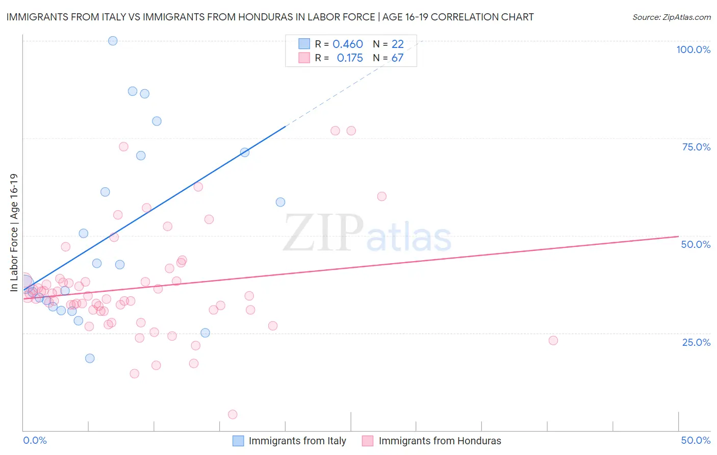 Immigrants from Italy vs Immigrants from Honduras In Labor Force | Age 16-19 Correlation Chart