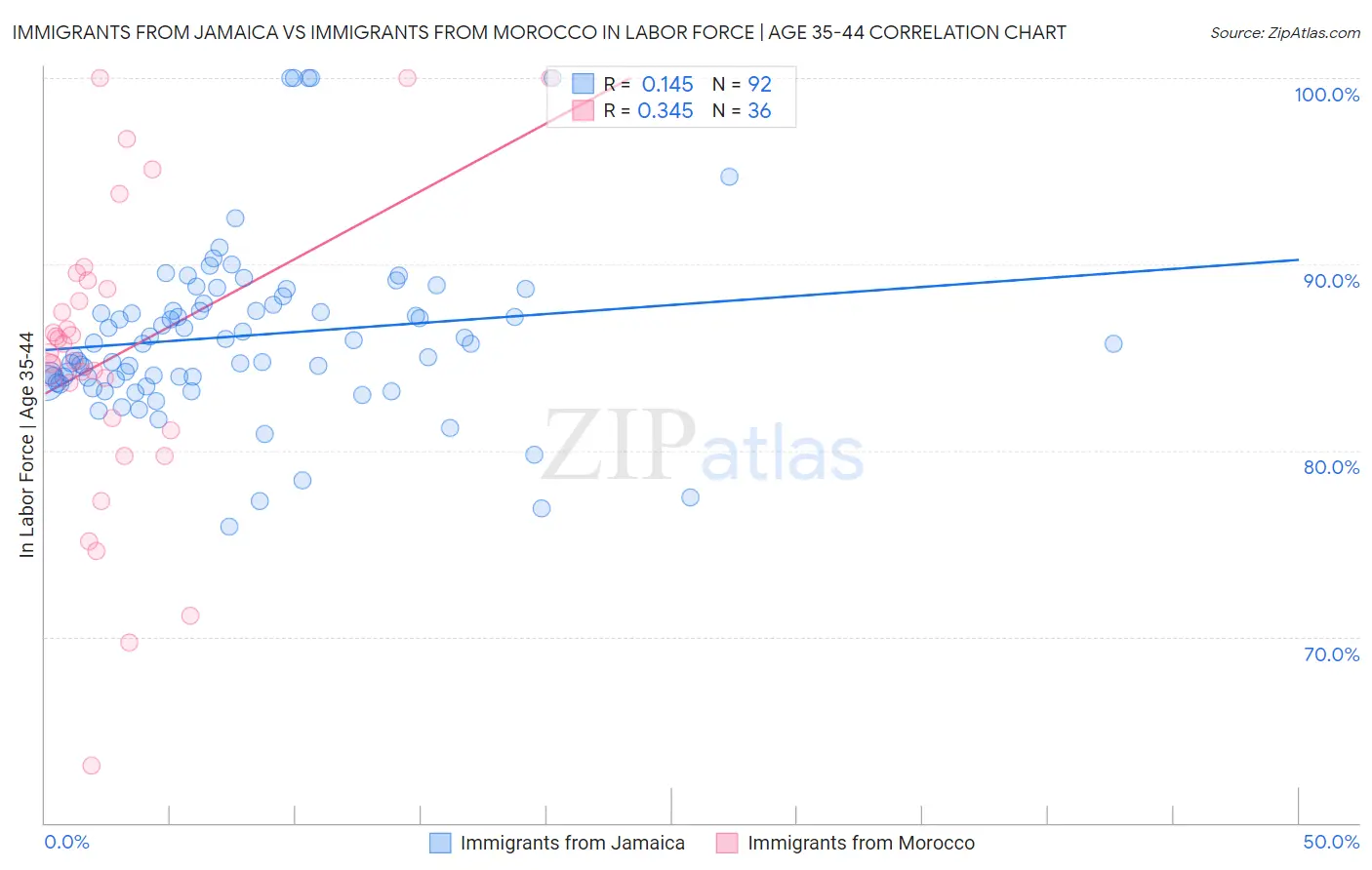 Immigrants from Jamaica vs Immigrants from Morocco In Labor Force | Age 35-44 Correlation Chart