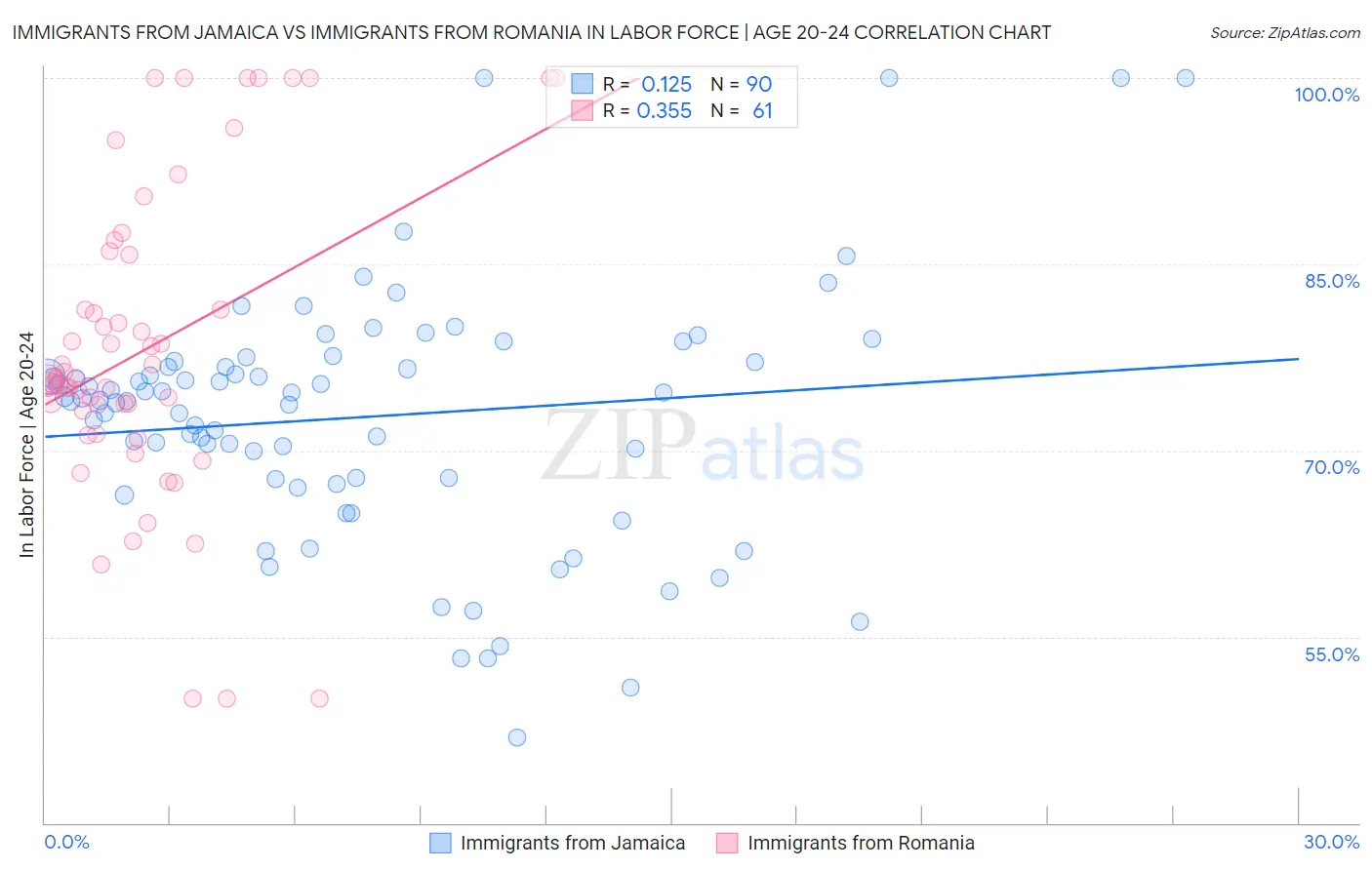 Immigrants from Jamaica vs Immigrants from Romania In Labor Force | Age 20-24 Correlation Chart