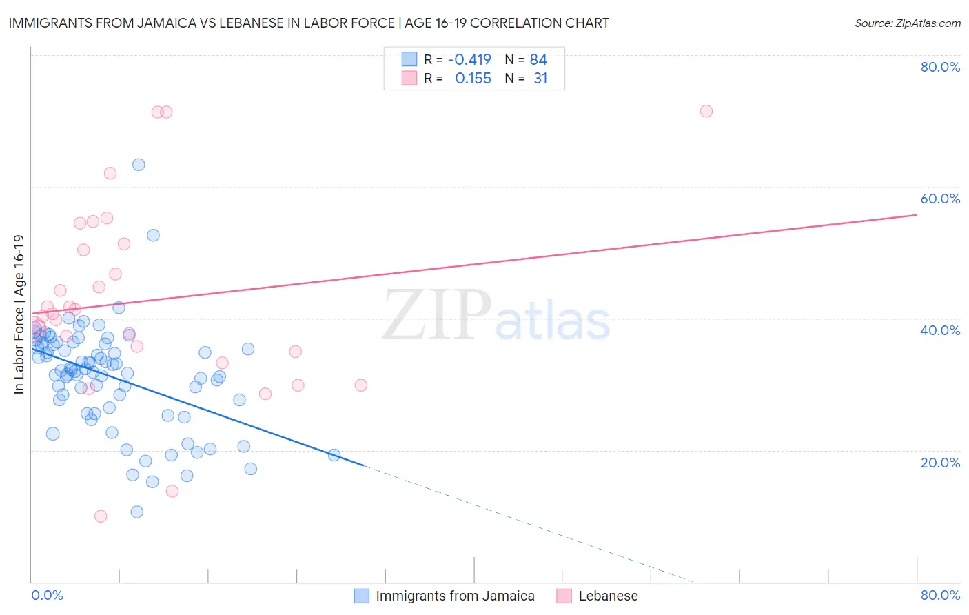 Immigrants from Jamaica vs Lebanese In Labor Force | Age 16-19 Correlation Chart
