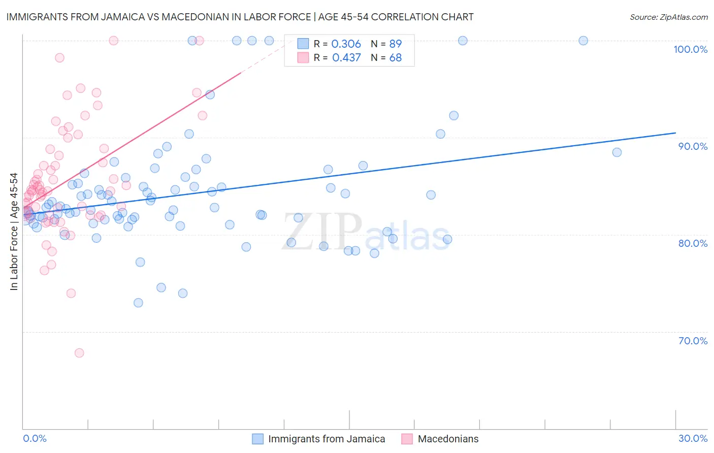 Immigrants from Jamaica vs Macedonian In Labor Force | Age 45-54 Correlation Chart
