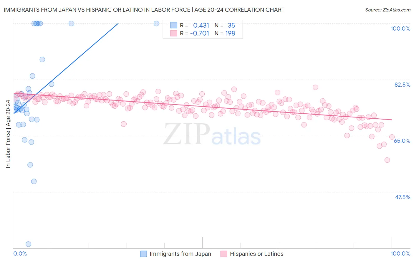 Immigrants from Japan vs Hispanic or Latino In Labor Force | Age 20-24 Correlation Chart