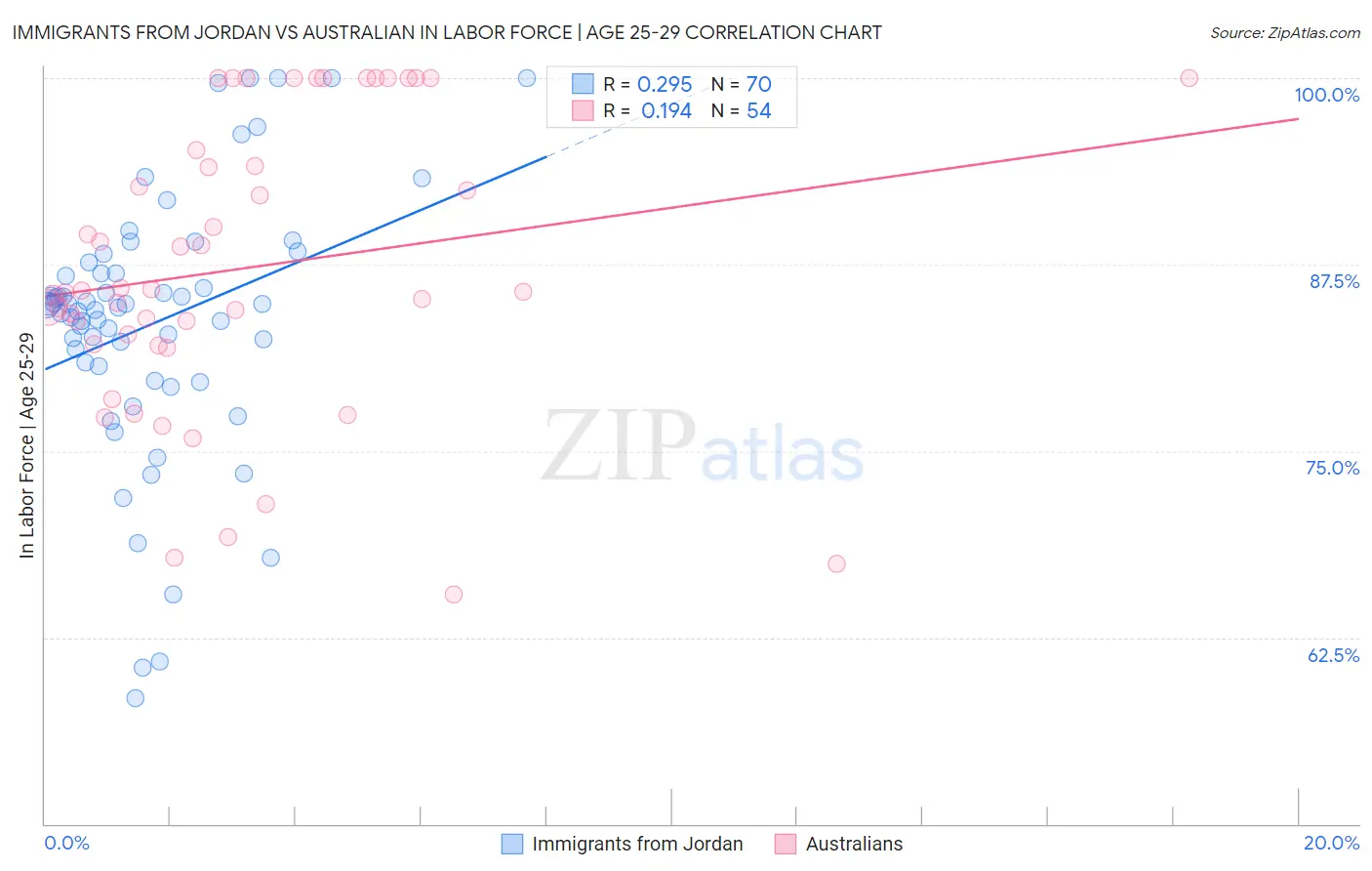 Immigrants from Jordan vs Australian In Labor Force | Age 25-29 Correlation Chart