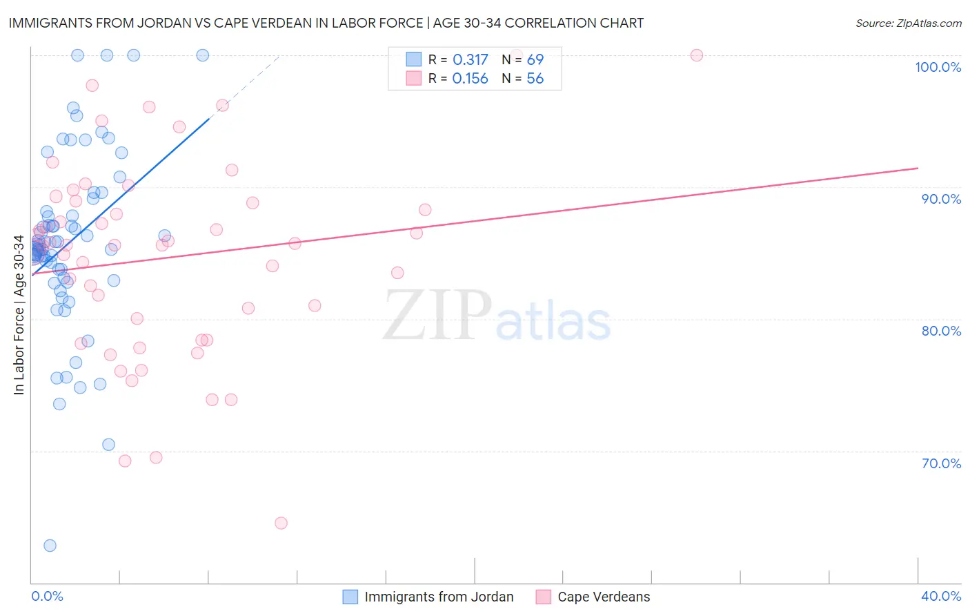 Immigrants from Jordan vs Cape Verdean In Labor Force | Age 30-34 Correlation Chart