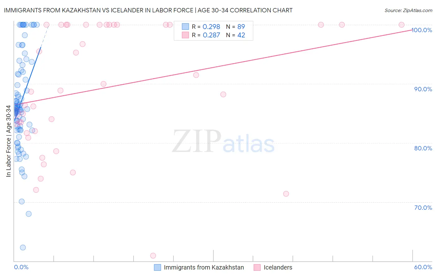 Immigrants from Kazakhstan vs Icelander In Labor Force | Age 30-34 Correlation Chart