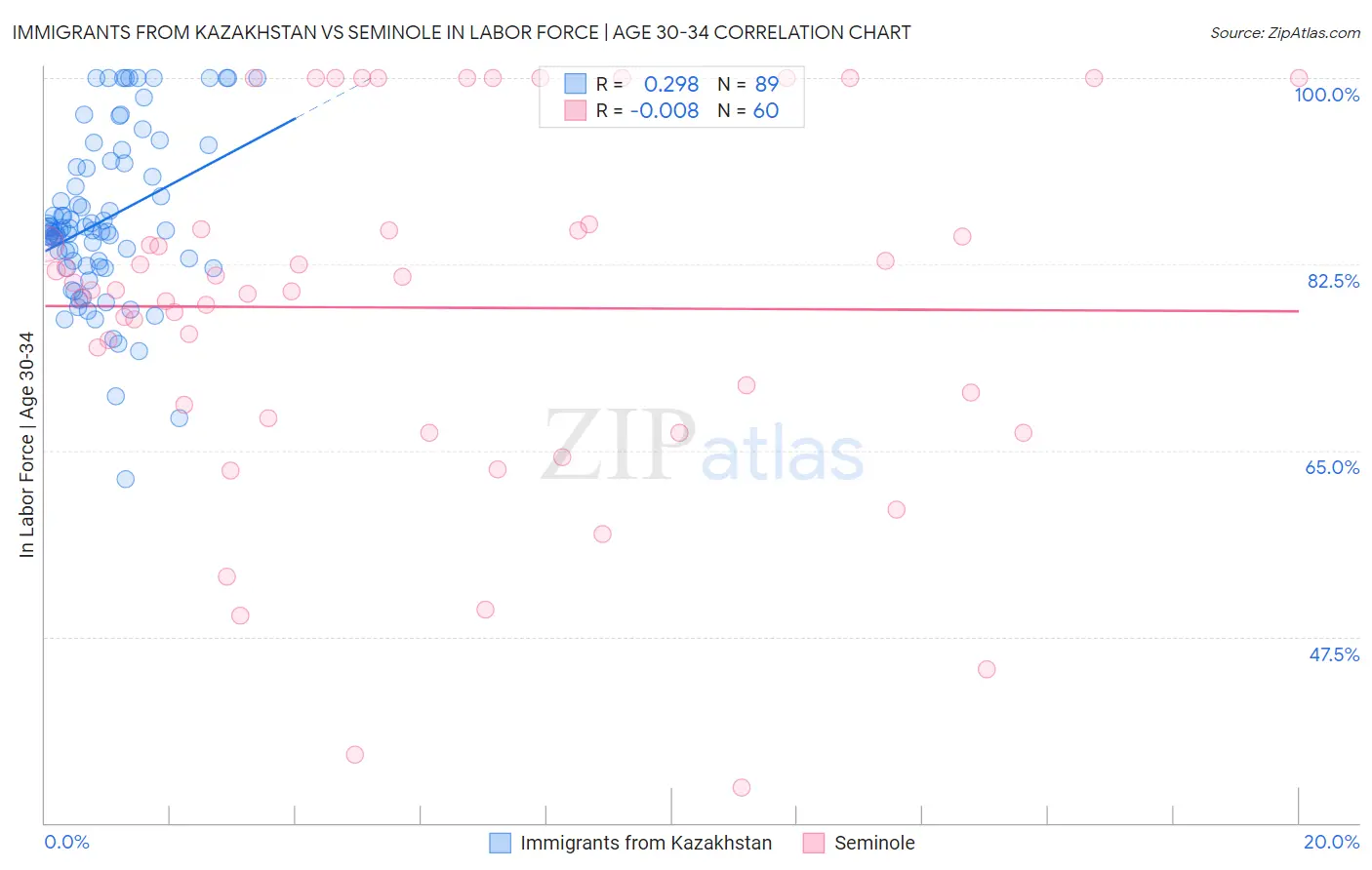 Immigrants from Kazakhstan vs Seminole In Labor Force | Age 30-34 Correlation Chart