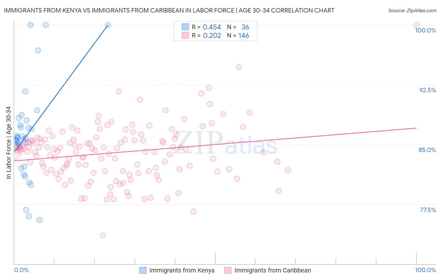 Immigrants from Kenya vs Immigrants from Caribbean In Labor Force | Age 30-34 Correlation Chart