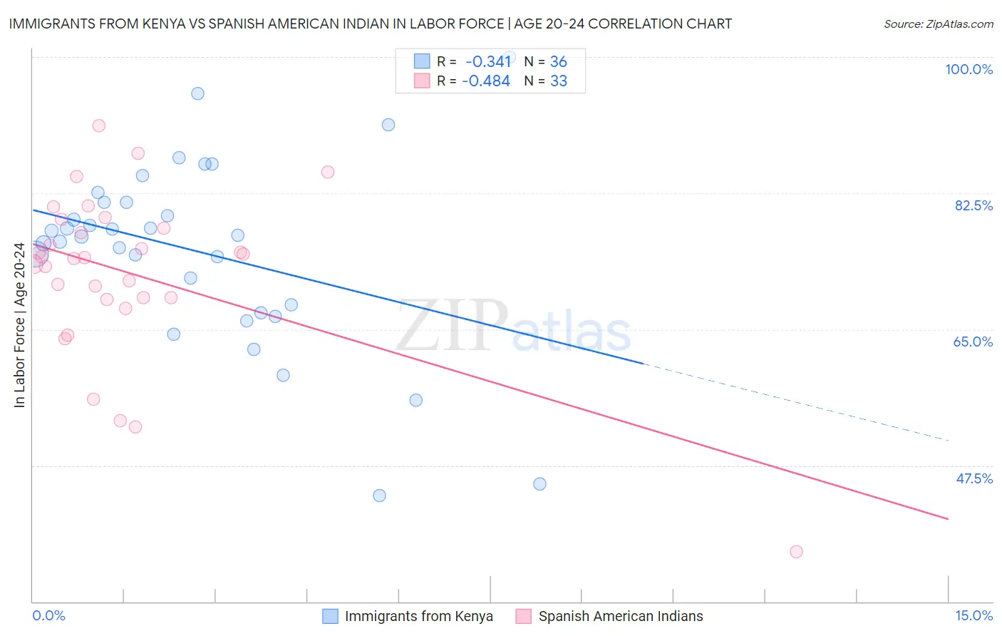 The statistical analysis conducted on geographies consisting of 218,076,104 people shows a mild negative correlation between the proportion of Immigrants from Kenya and labor force participation rate among population between the ages 20 and 24 in the United States with a correlation coefficient (R) of -0.341 and weighted average of 77.0%. Similarly, the statistical analysis conducted on geographies consisting of 73,146,145 people shows a moderate negative correlation between the proportion of Spanish American Indians and labor force participation rate among population between the ages 20 and 24 in the United States with a correlation coefficient (R) of -0.484 and weighted average of 73.7%, a difference of 4.4%.