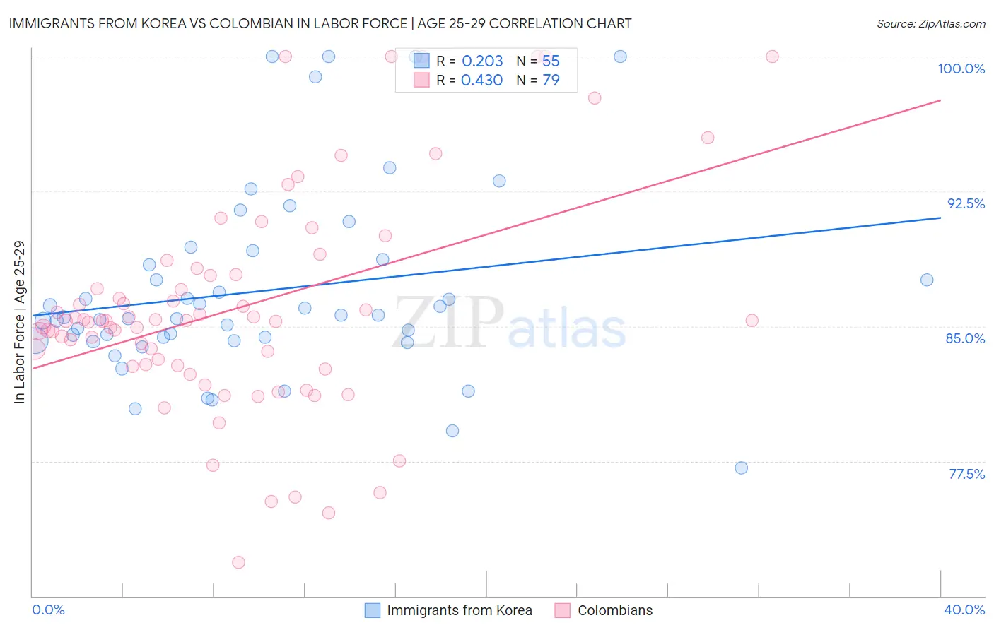 Immigrants from Korea vs Colombian In Labor Force | Age 25-29 Correlation Chart