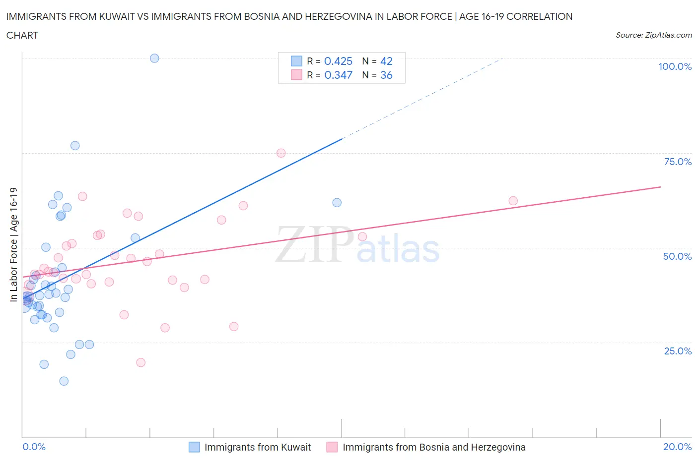 Immigrants from Kuwait vs Immigrants from Bosnia and Herzegovina In Labor Force | Age 16-19 Correlation Chart