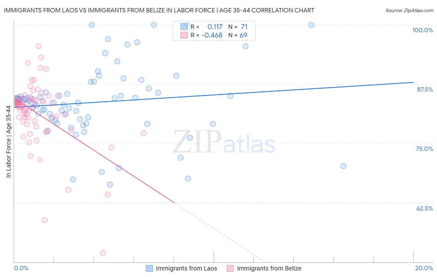 Immigrants from Laos vs Immigrants from Belize In Labor Force | Age 35-44 Correlation Chart