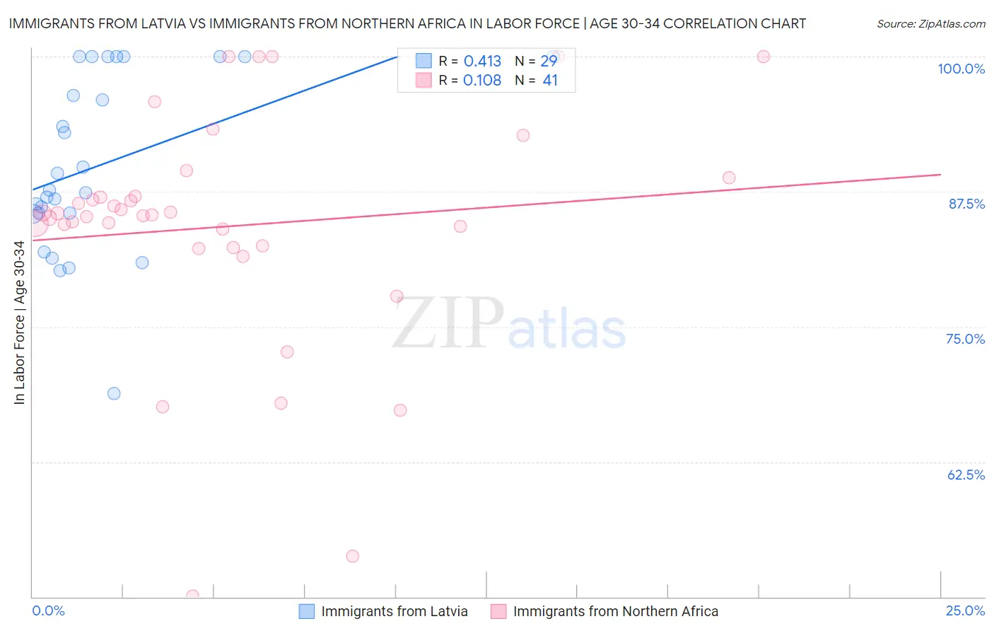 Immigrants from Latvia vs Immigrants from Northern Africa In Labor Force | Age 30-34 Correlation Chart