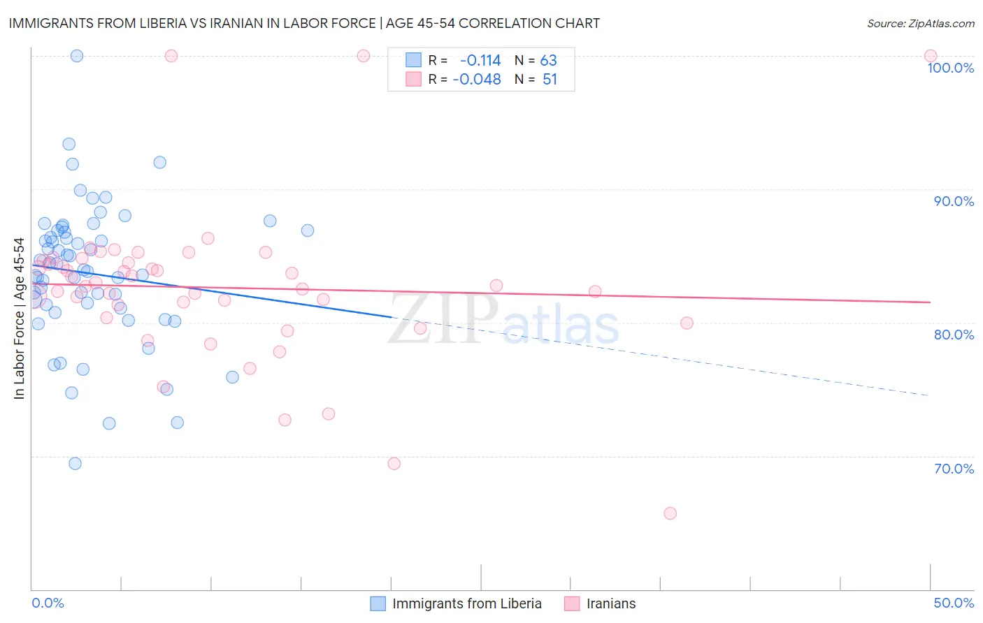 Immigrants from Liberia vs Iranian In Labor Force | Age 45-54 Correlation Chart