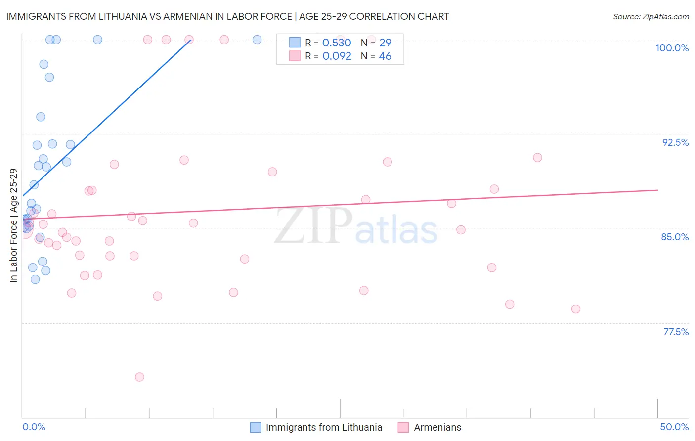 Immigrants from Lithuania vs Armenian In Labor Force | Age 25-29 Correlation Chart