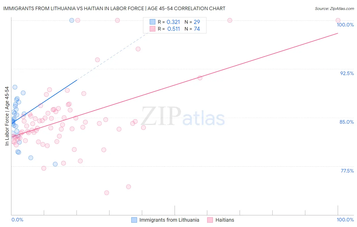 Immigrants from Lithuania vs Haitian In Labor Force | Age 45-54 Correlation Chart