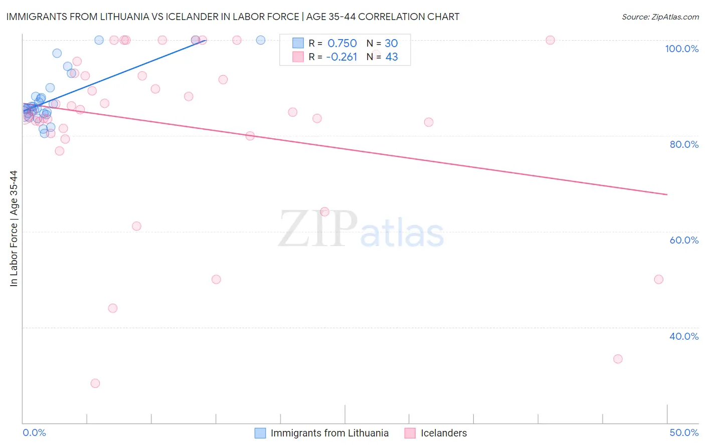 Immigrants from Lithuania vs Icelander In Labor Force | Age 35-44 Correlation Chart
