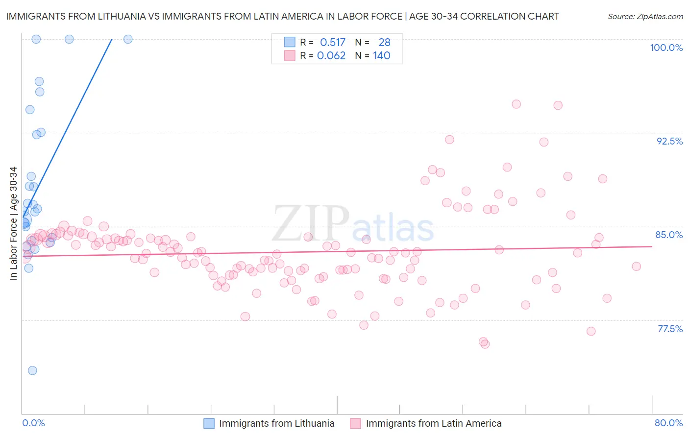 Immigrants from Lithuania vs Immigrants from Latin America In Labor Force | Age 30-34 Correlation Chart