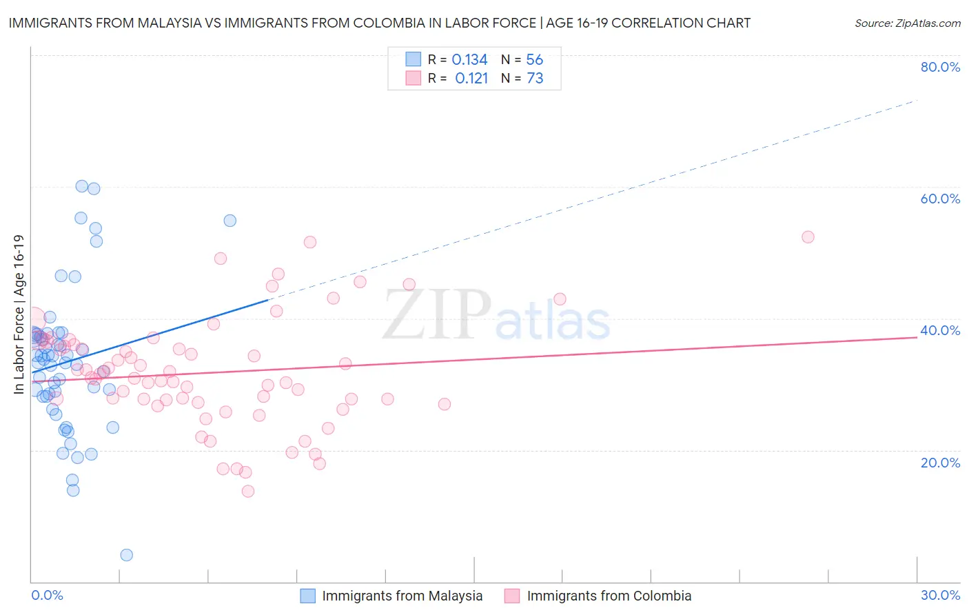Immigrants from Malaysia vs Immigrants from Colombia In Labor Force | Age 16-19 Correlation Chart