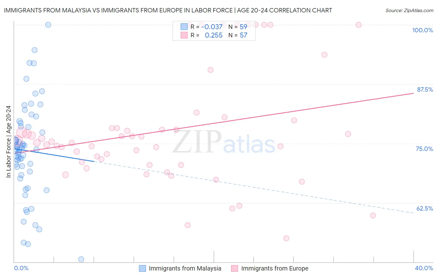 Immigrants from Malaysia vs Immigrants from Europe In Labor Force | Age 20-24 Correlation Chart