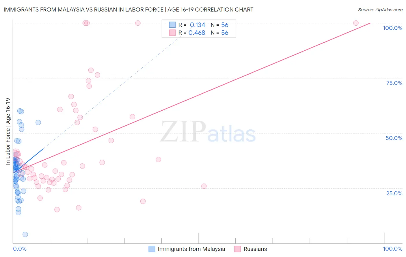 Immigrants from Malaysia vs Russian In Labor Force | Age 16-19 Correlation Chart