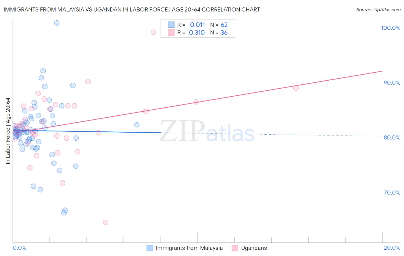 Immigrants from Malaysia vs Ugandan In Labor Force | Age 20-64 Correlation Chart