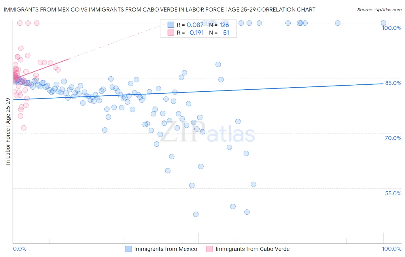 Immigrants from Mexico vs Immigrants from Cabo Verde In Labor Force | Age 25-29 Correlation Chart