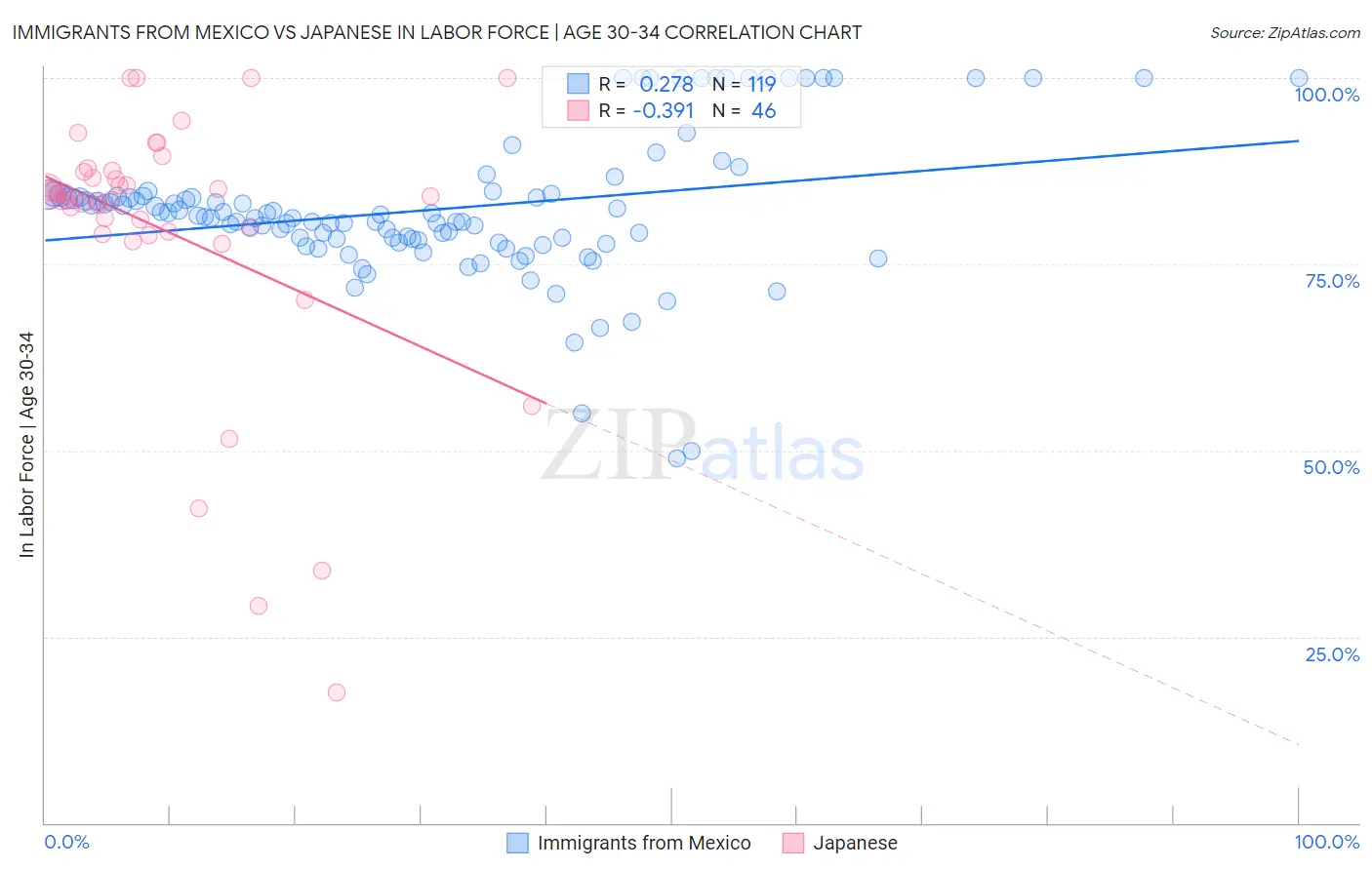 Immigrants from Mexico vs Japanese In Labor Force | Age 30-34 Correlation Chart