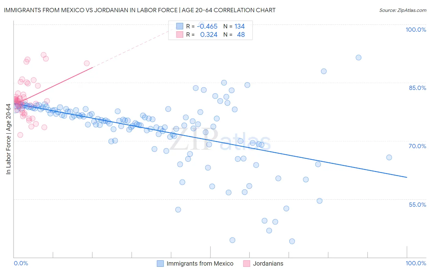 Immigrants from Mexico vs Jordanian In Labor Force | Age 20-64 Correlation Chart