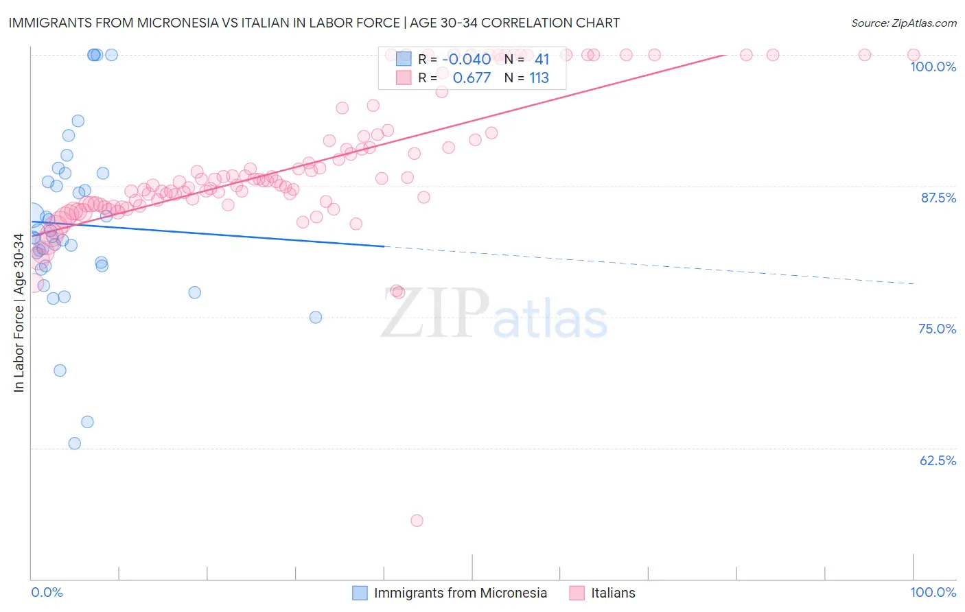 Immigrants from Micronesia vs Italian In Labor Force | Age 30-34 Correlation Chart