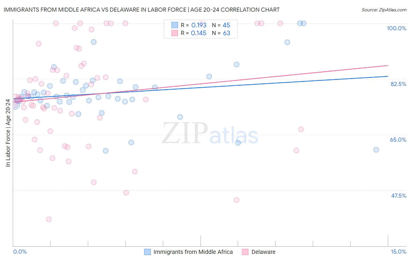 Immigrants from Middle Africa vs Delaware In Labor Force | Age 20-24 Correlation Chart
