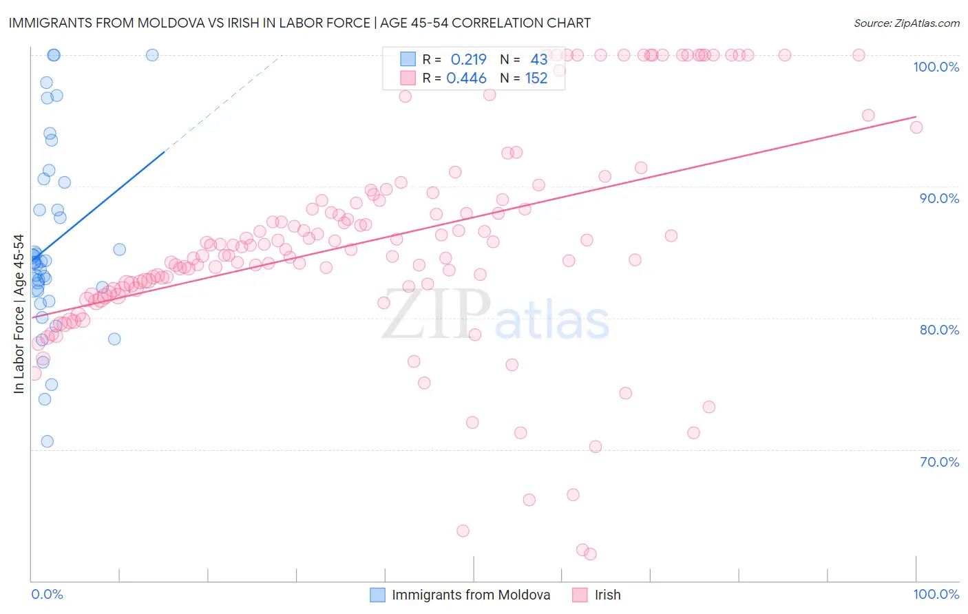 Immigrants from Moldova vs Irish In Labor Force | Age 45-54 Correlation Chart