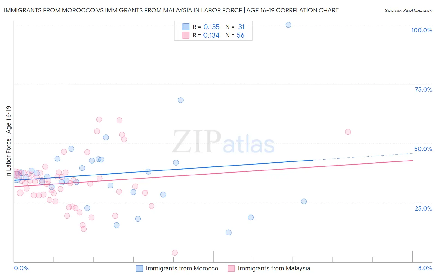 Immigrants from Morocco vs Immigrants from Malaysia In Labor Force | Age 16-19 Correlation Chart