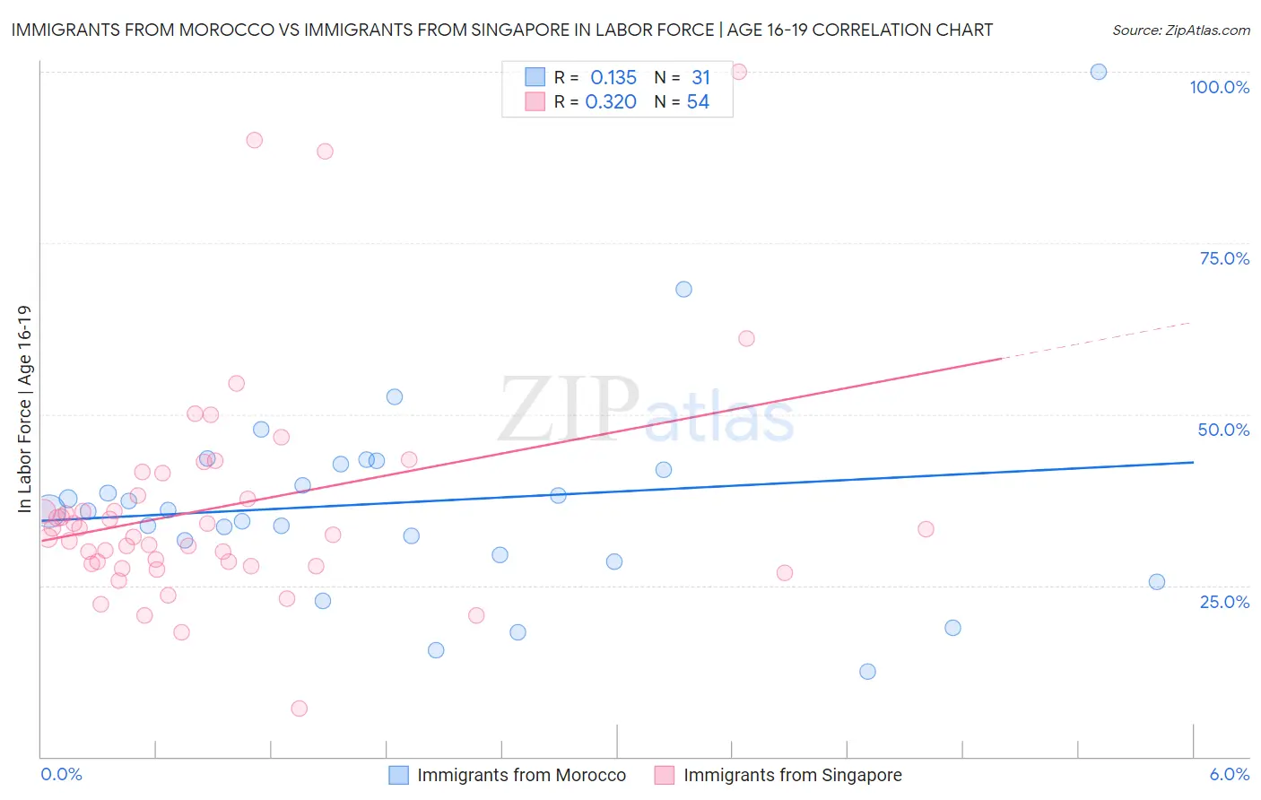 Immigrants from Morocco vs Immigrants from Singapore In Labor Force | Age 16-19 Correlation Chart