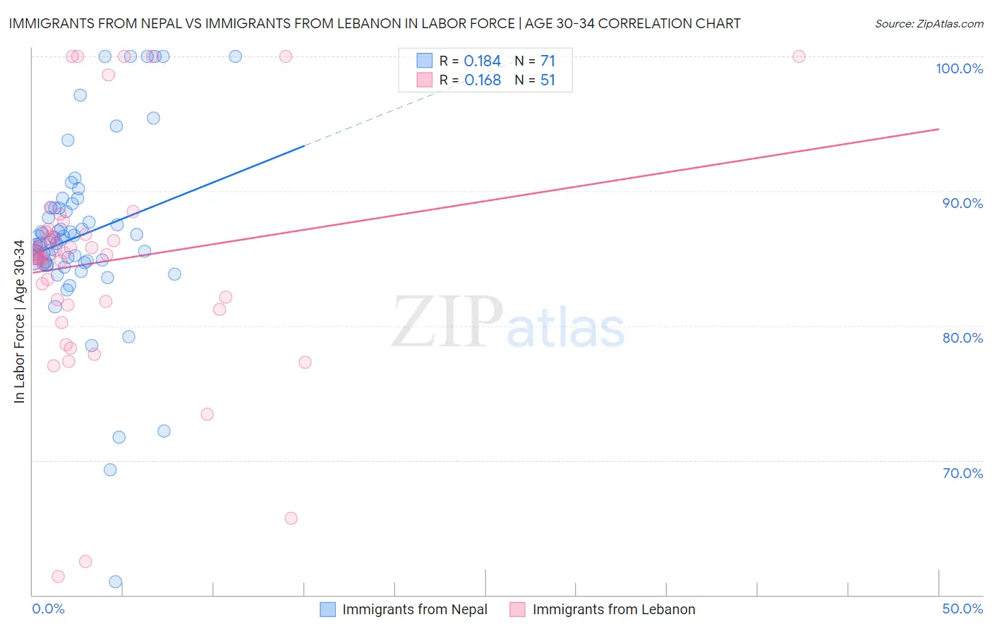 Immigrants from Nepal vs Immigrants from Lebanon In Labor Force | Age 30-34 Correlation Chart