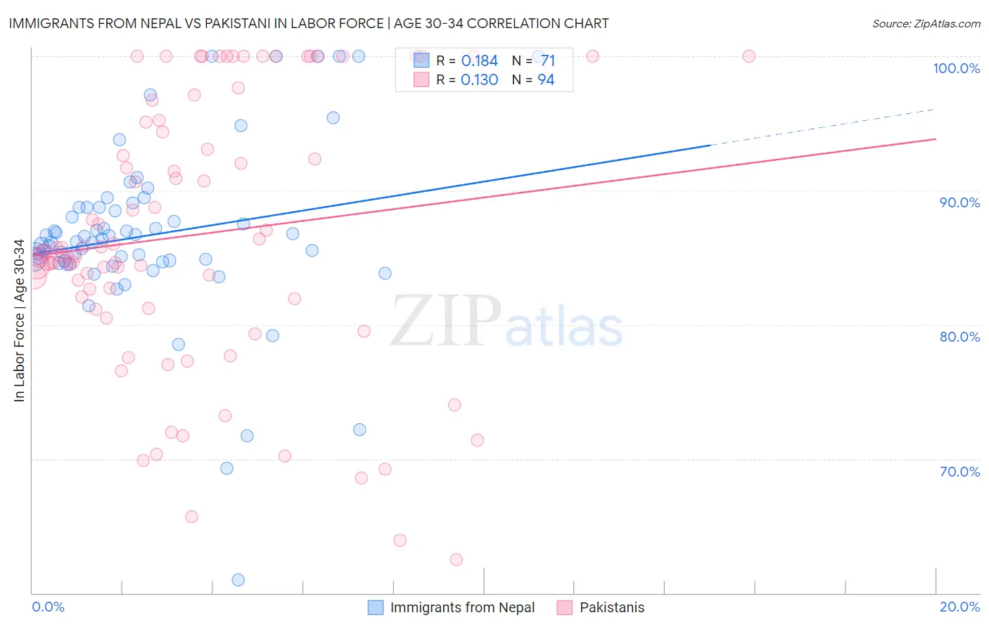 Immigrants from Nepal vs Pakistani In Labor Force | Age 30-34 Correlation Chart