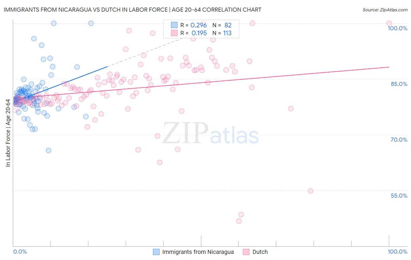 Immigrants from Nicaragua vs Dutch In Labor Force | Age 20-64 Correlation Chart