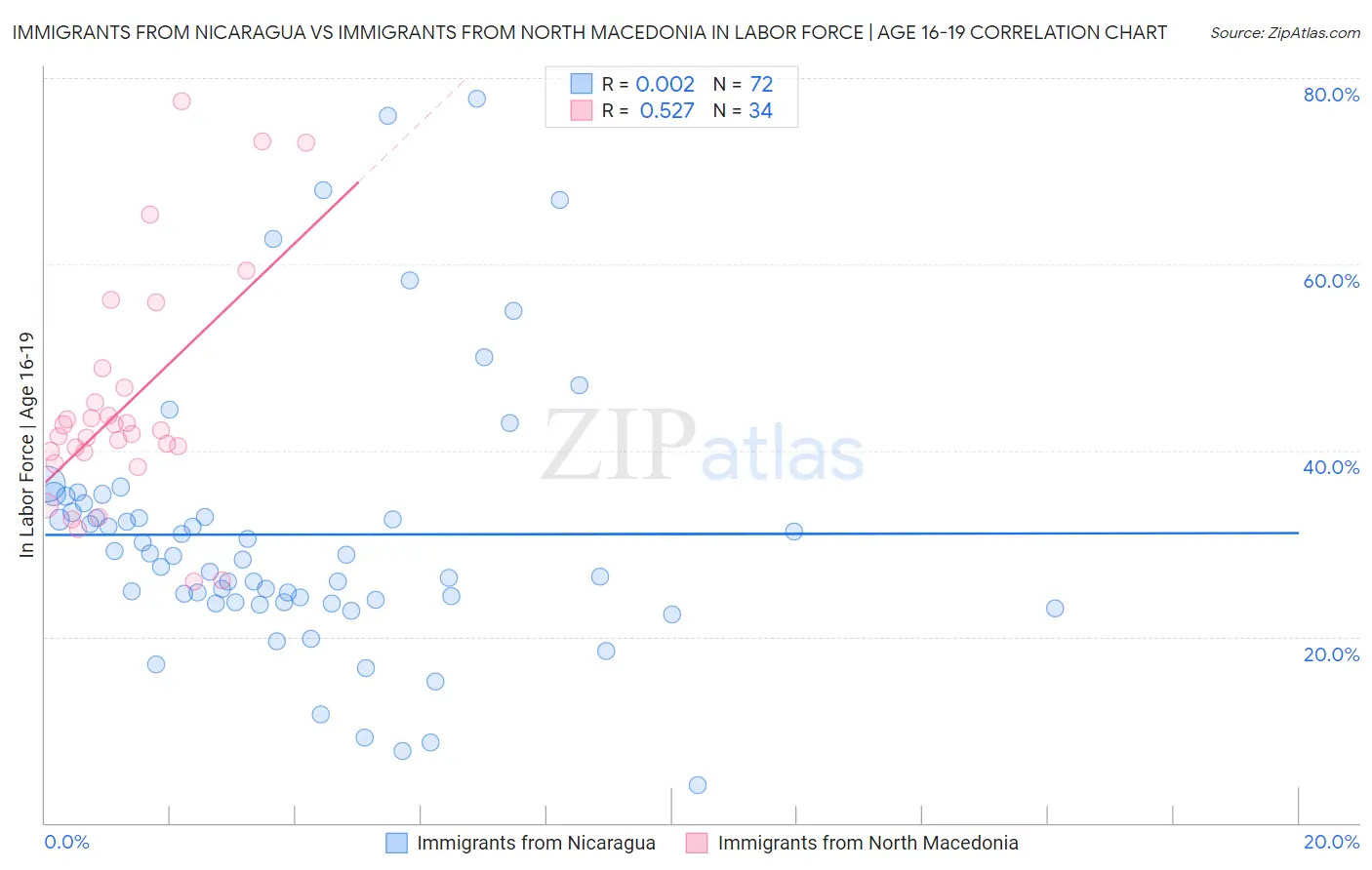 Immigrants from Nicaragua vs Immigrants from North Macedonia In Labor Force | Age 16-19 Correlation Chart