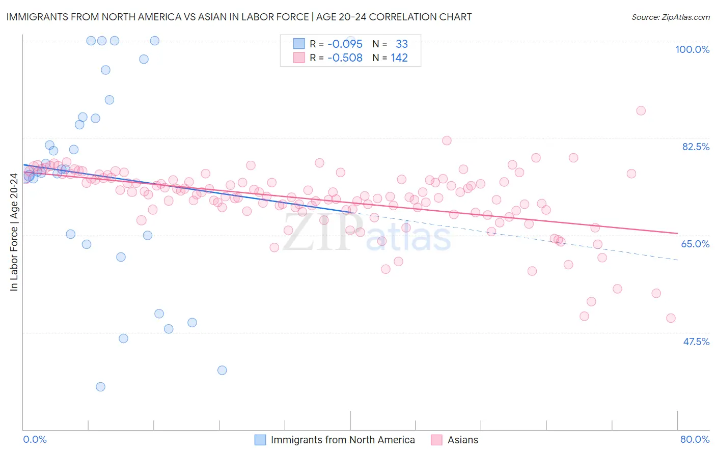 Immigrants from North America vs Asian In Labor Force | Age 20-24 Correlation Chart