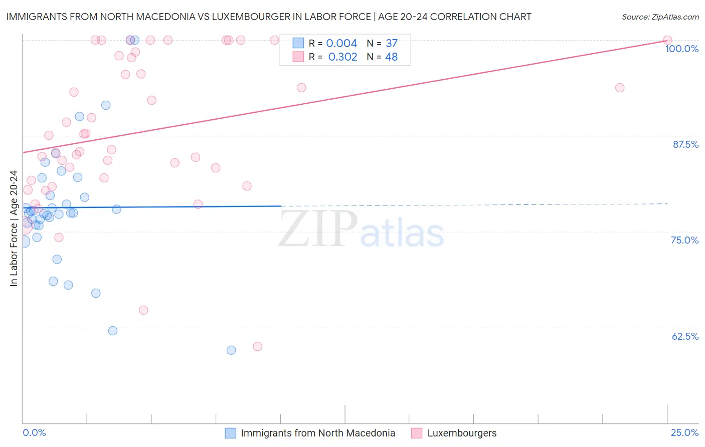 Immigrants from North Macedonia vs Luxembourger In Labor Force | Age 20-24 Correlation Chart