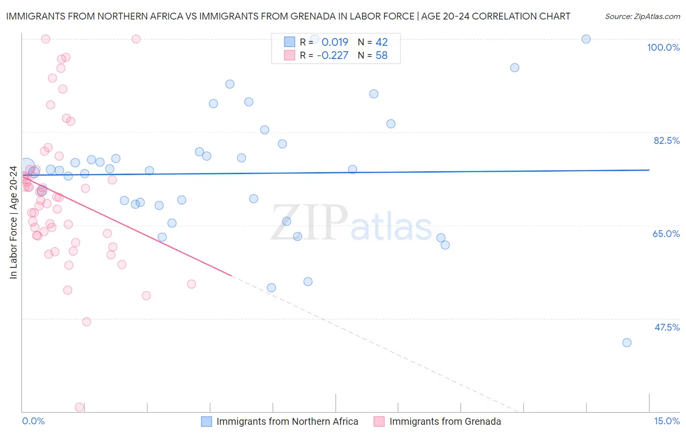 Immigrants from Northern Africa vs Immigrants from Grenada In Labor Force | Age 20-24 Correlation Chart