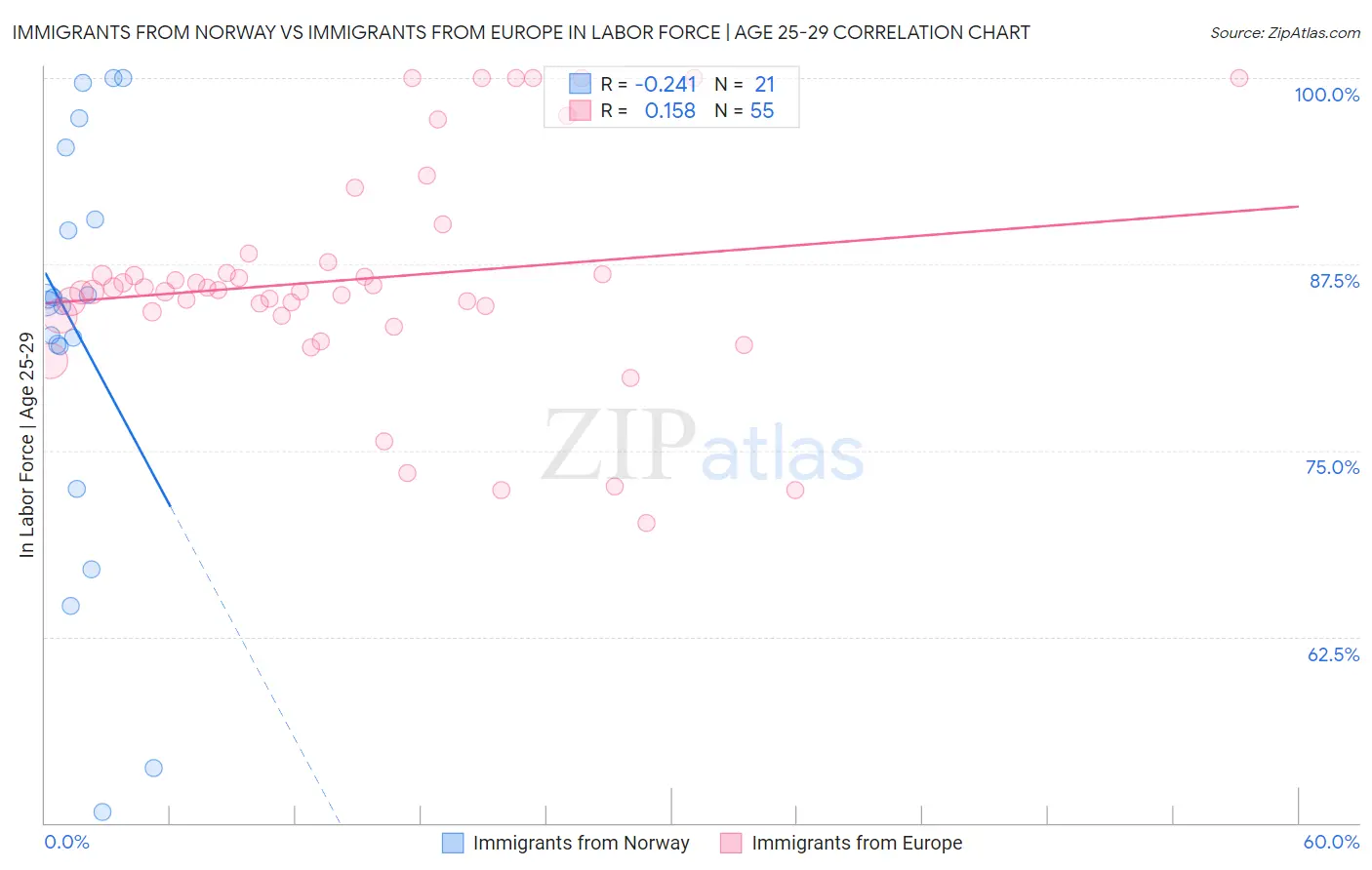 Immigrants from Norway vs Immigrants from Europe In Labor Force | Age 25-29 Correlation Chart