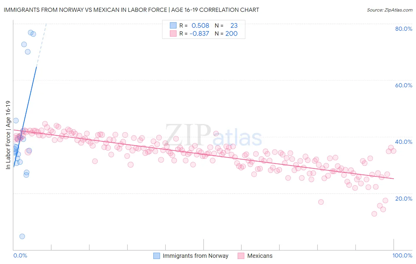Immigrants from Norway vs Mexican In Labor Force | Age 16-19 Correlation Chart