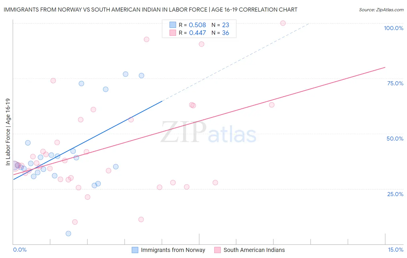 Immigrants from Norway vs South American Indian In Labor Force | Age 16-19 Correlation Chart