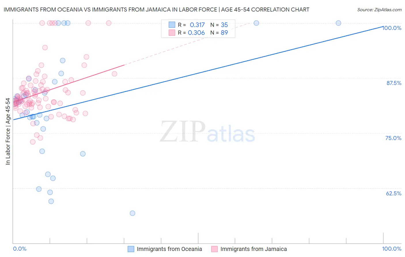 Immigrants from Oceania vs Immigrants from Jamaica In Labor Force | Age 45-54 Correlation Chart