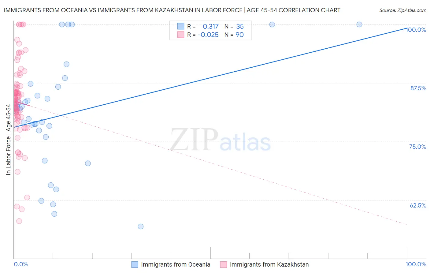 Immigrants from Oceania vs Immigrants from Kazakhstan In Labor Force | Age 45-54 Correlation Chart