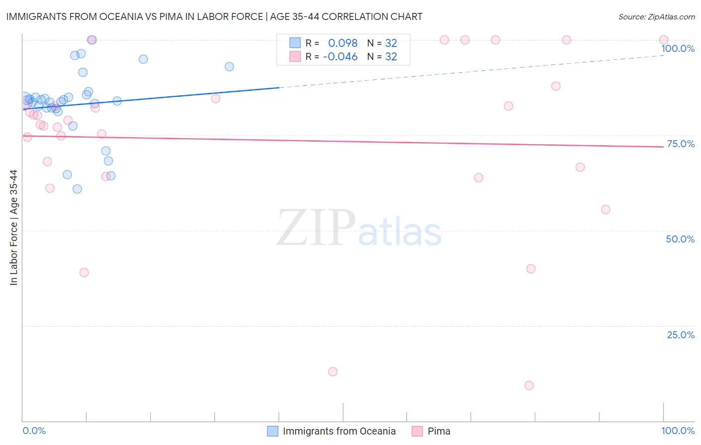 Immigrants from Oceania vs Pima In Labor Force | Age 35-44 Correlation Chart