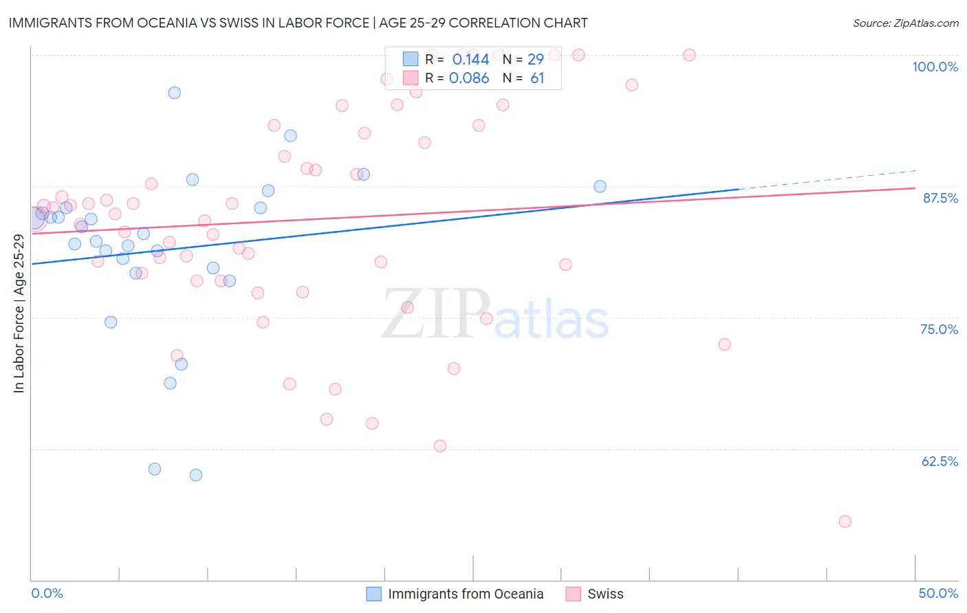 Immigrants from Oceania vs Swiss In Labor Force | Age 25-29 Correlation Chart