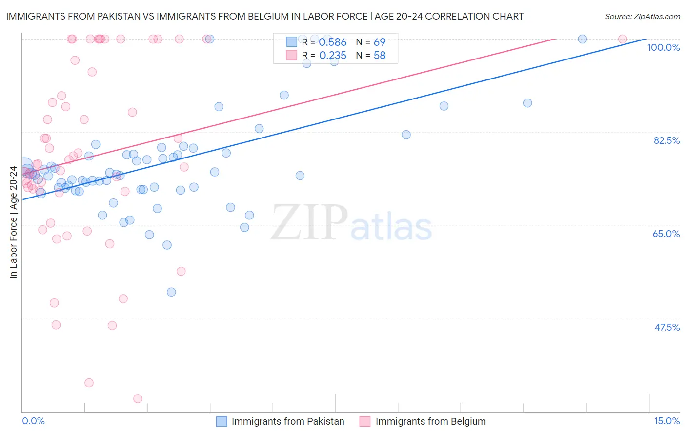 Immigrants from Pakistan vs Immigrants from Belgium In Labor Force | Age 20-24 Correlation Chart