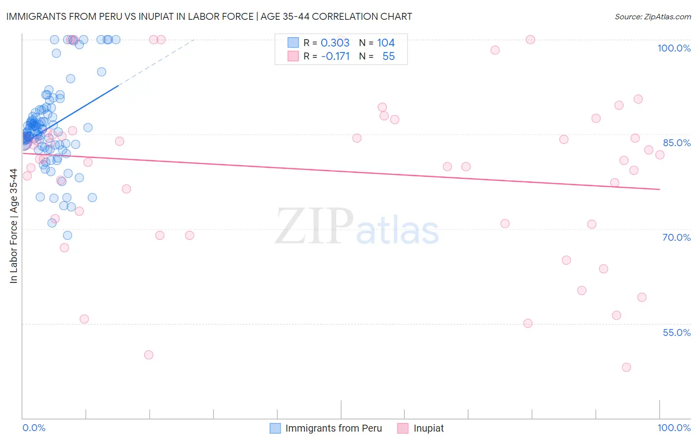 Immigrants from Peru vs Inupiat In Labor Force | Age 35-44 Correlation Chart