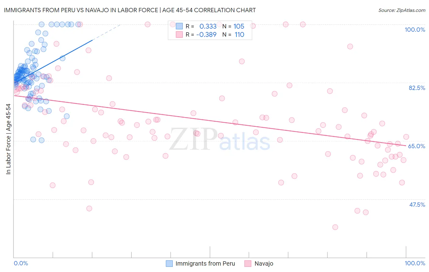 Immigrants from Peru vs Navajo In Labor Force | Age 45-54 Correlation Chart